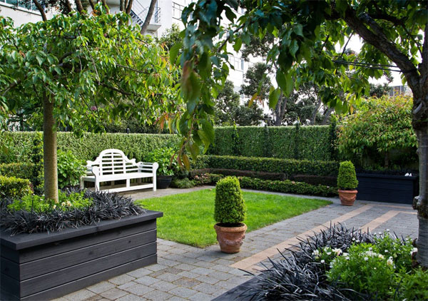 如果你想给你的院子增加一些温馨、温暖、私享体验,可以考虑阳光小草坪和白色条形座椅,并且采用人工修剪的绿篱来半围合你的庭院! 与垂直绿篱比较起来,阳光小草坪不仅吸纳了更多的阳光,而且提供了一个完整的平地,你可以联想起海洋,仿佛有无尽的波涛甚至海鸥。这时,白色条形座椅提供了一个观景协助点,鲜明的白色能够起到呼应大海的效果。让空间变大了。赤土色陶罐花盆带来一丝农家院落感,融合了简朴的生活情趣。